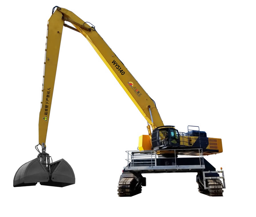 該設(shè)備分別采用原裝進(jìn)口康明斯發(fā)動(dòng)機(jī)、380V西門(mén)子電機(jī),以及全套采用施耐德控制系統(tǒng)拖動(dòng)控制兩套液壓動(dòng)力機(jī)構(gòu),該機(jī)設(shè)計(jì)了寬體結(jié)構(gòu)梁,以及加強(qiáng)型可更換正、負(fù)差的二節(jié)式作業(yè)主臂,最大吊重量達(dá) 25 噸、最大作業(yè)半徑為 24米。在5至12米作業(yè)半徑內(nèi),可配備 5.0 立方蚌殼抓斗,或2.5立方梅花廢鋼抓斗。